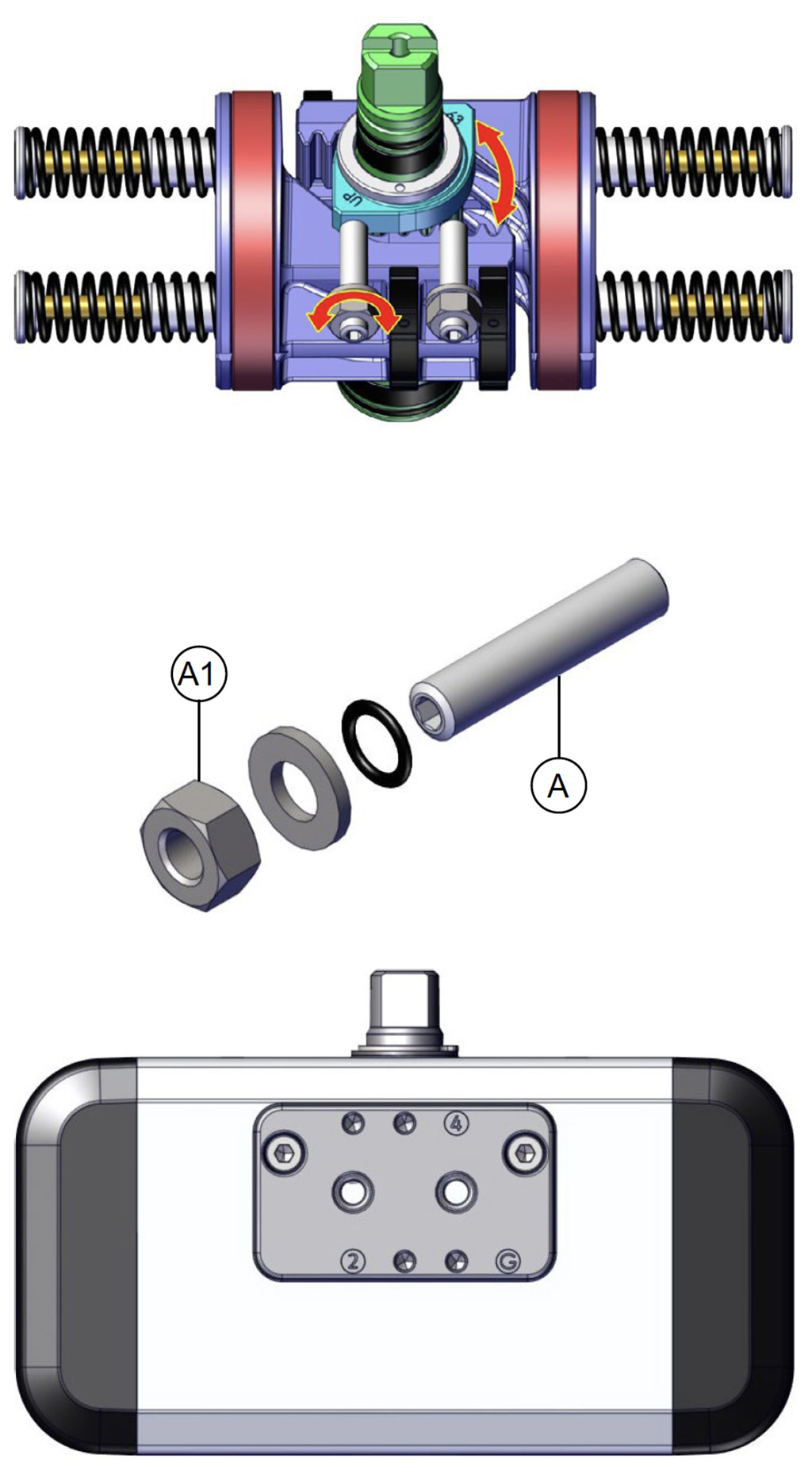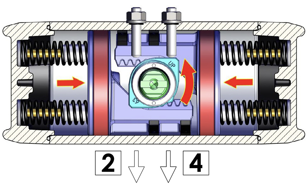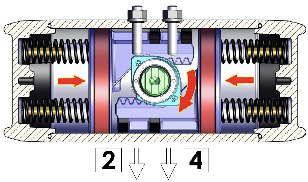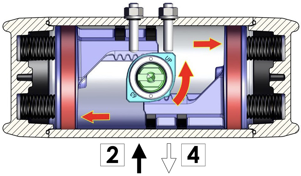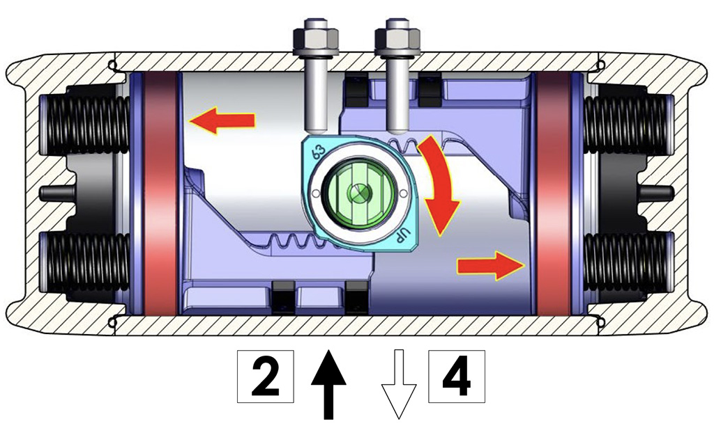 Besleme basıncı olmadan, tek etkili versiyonda aktüatör, milin saat yönünde dönüşünü gerçekleştirerek otomatik olarak bekleme konumuna geri döner ve nihai konum, çizimde gösterilen şekildedir. Toz veya katı partiküllerin silindir haznesine hava geçişini engellemeden girmesini önlemek için delik 4'e bir filtre monte edilmesi önerilir.