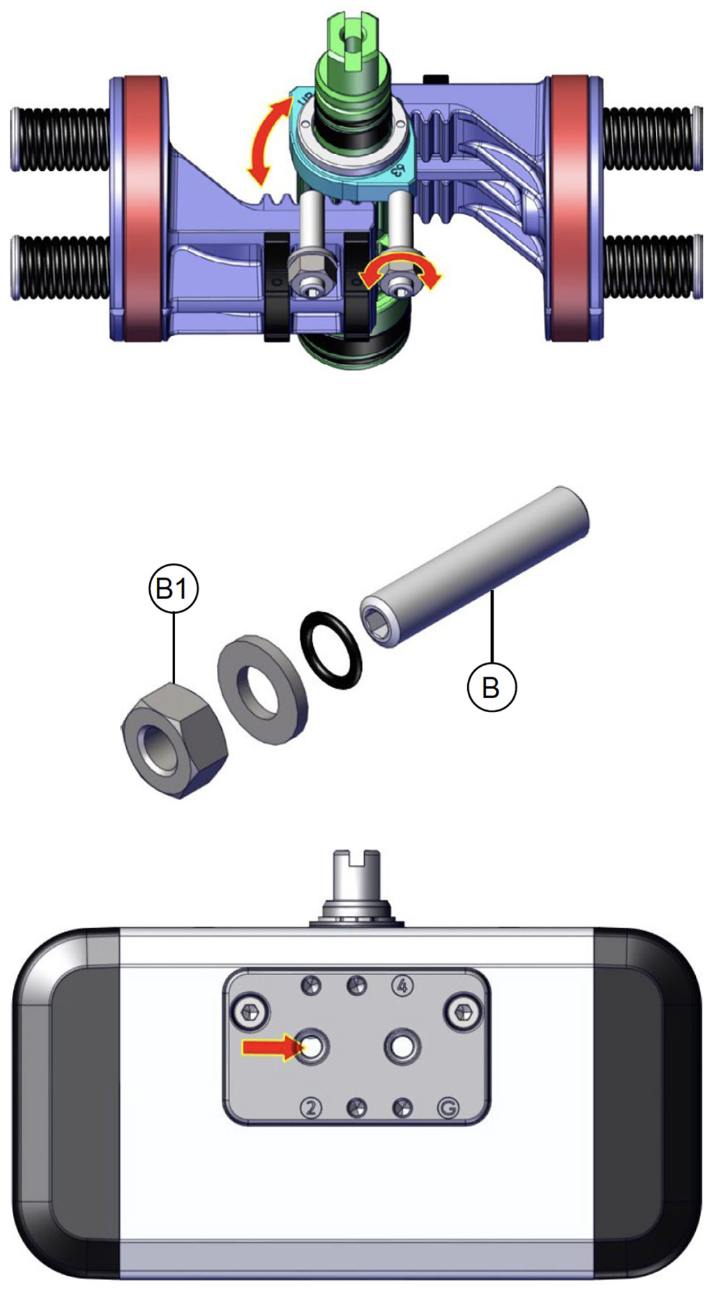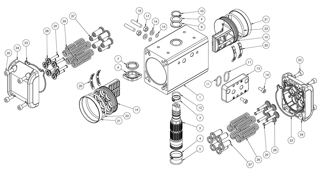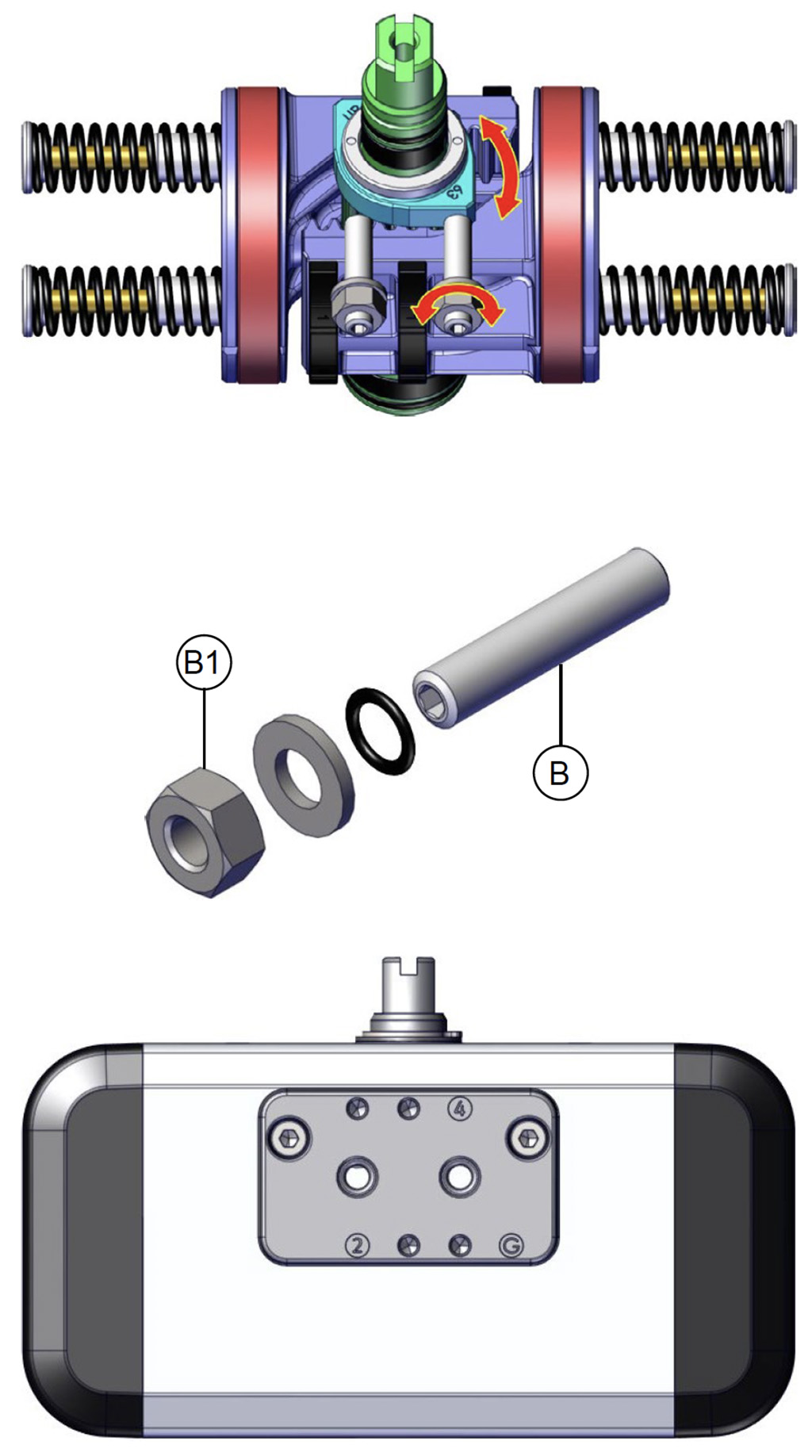 Besleme basıncı olmadan, tek etkili versiyonda aktüatör, milin saat yönünde dönüşünü gerçekleştirerek otomatik olarak bekleme konumuna geri döner ve nihai konum, çizimde gösterilen şekildedir. Toz veya katı partiküllerin silindir haznesine hava geçişini engellemeden girmesini önlemek için delik 4'e bir filtre monte edilmesi önerilir.